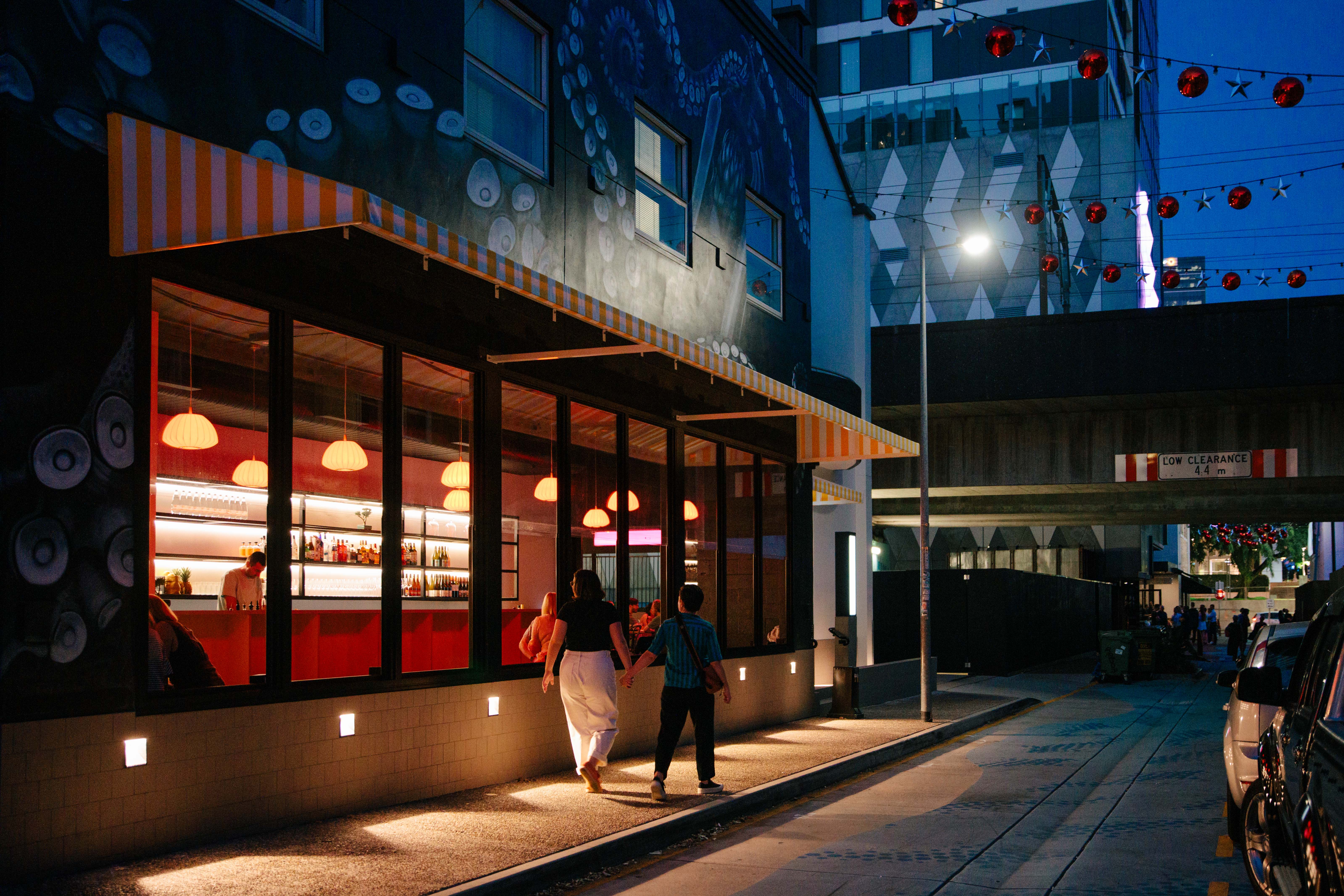 The split-level layout of the tenancy inspired the core concept of a performance space, with the full-width staircase imagined as a stage complete with tiered wings and curtains (that double as change rooms), lending the retail space beyond a backstage feel. The stage, block-coloured in deep blue, creates a striking portal that draws the eye, inviting intrigued foot traffic into the store. Overhead, a linear array of LED strip lights transforms the space at night, infusing it with a nightclub atmosphere and enhancing its versatility for events and gigs.